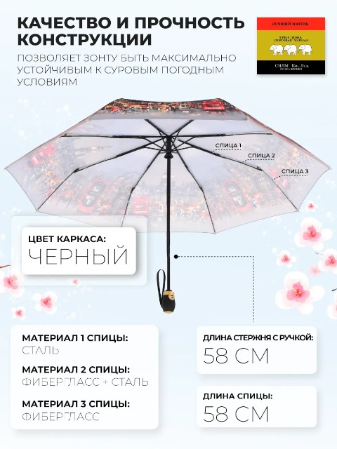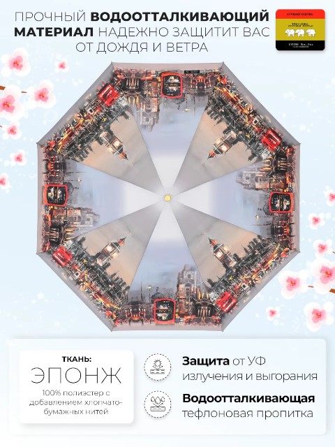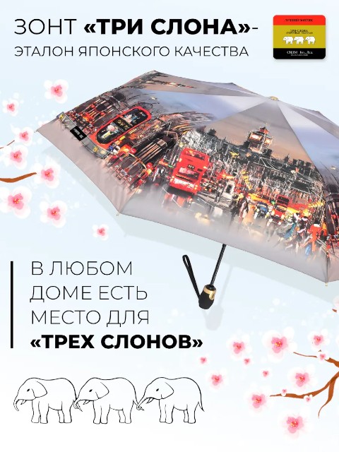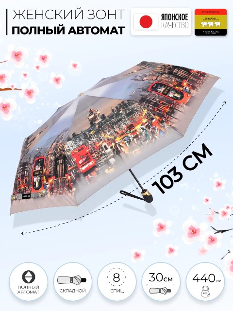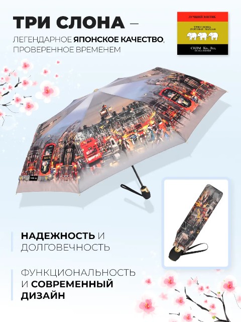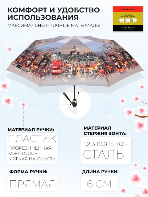 Изящный яркий женский зонт Три слона L3801 от дождя для женщин представляет известный японский производитель. Женский зонтик с ярким и романтичным видом прекрасного города. Будет приятно достать такой красочный зонт в пасмурную погоду. Зонт откроется и закроется мгновенно, нужно лишь нажать кнопку. Это полностью автоматическая система.