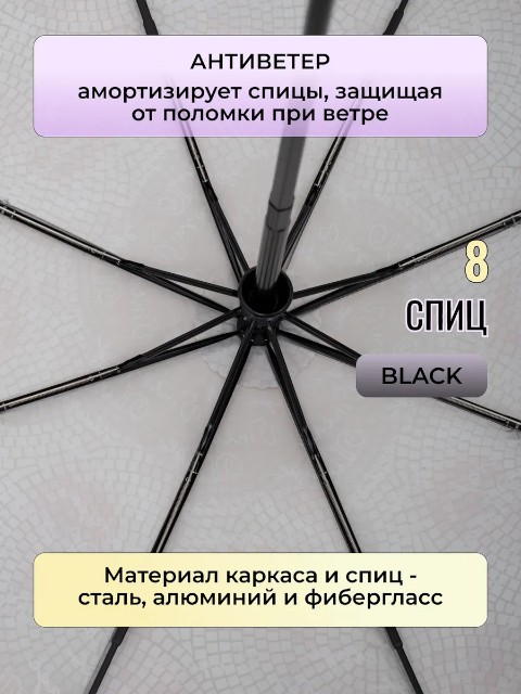 Каркас выполнен из стали с элементами из пластика и фибергласса и относится к категории усиленных, что повышает прочность и стабильность работы механизма. Купол держится на 8 спицах, а фиберглассовые окончания спиц добавляют гибкости и помогают снизить риск деформации при нагрузках. Встроенная система «Антиветер» уменьшает воздействие порывов ветра на каркас и повышает устойчивость зонта в непогоду.