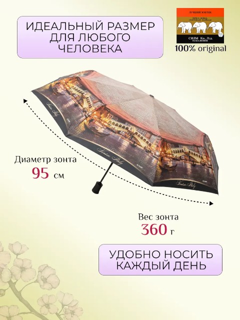 Женский зонт «Три слона» — компактный и надежный вариант для городской погоды. Модель рассчитана на ежедневное использование в дождь и ветер и выполнена в конструкции 3 сложения: в сложенном виде зонт легко помещается в сумку, а в раскрытом обеспечивает комфортное укрытие от осадков.