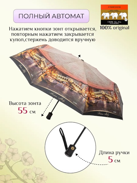 Механизм полный автомат позволяет открывать и закрывать зонт нажатием одной кнопки. Это удобно в транспорте и на улице, когда важно быстро раскрыть купол или сложить зонт одной рукой.