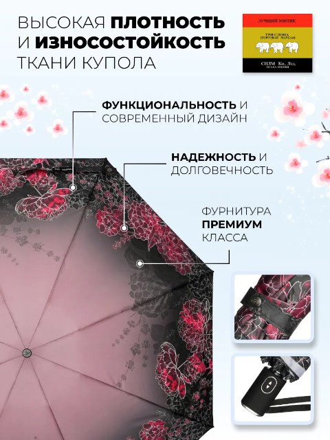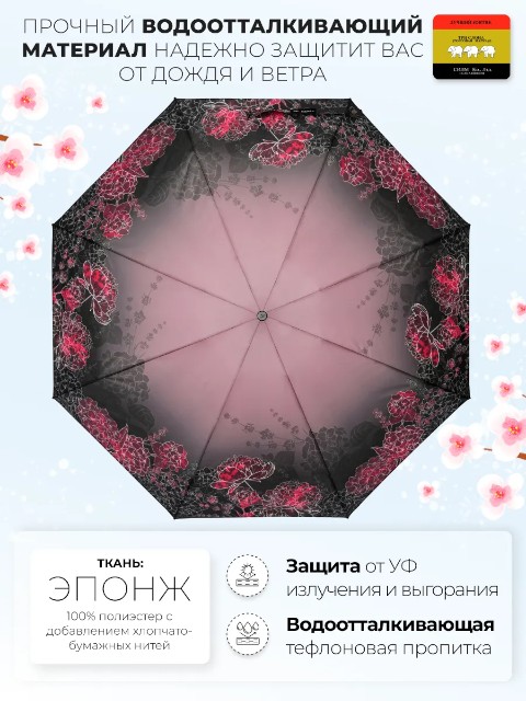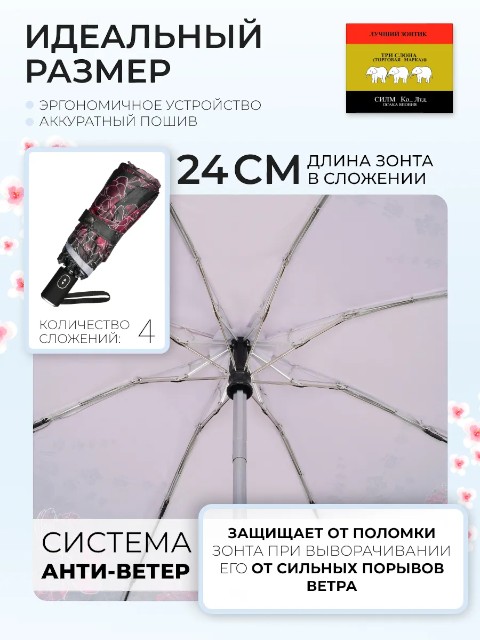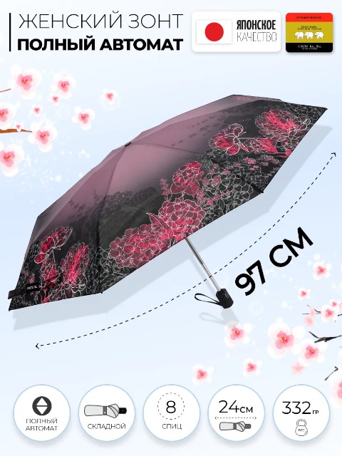 Модель оснащена механизмом полный автомат: зонт открывается и закрывается нажатием кнопки. В сложенном виде его длина 24 см, вес — 332 г, поэтому зонт удобно носить в сумке каждый день.