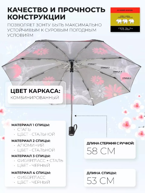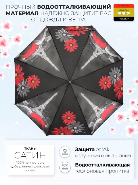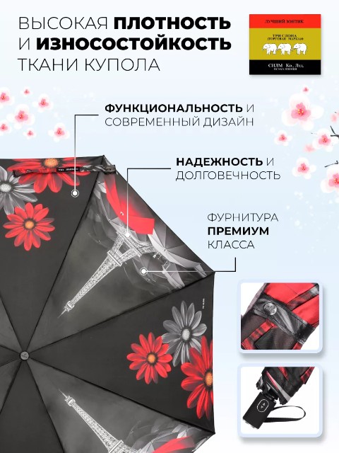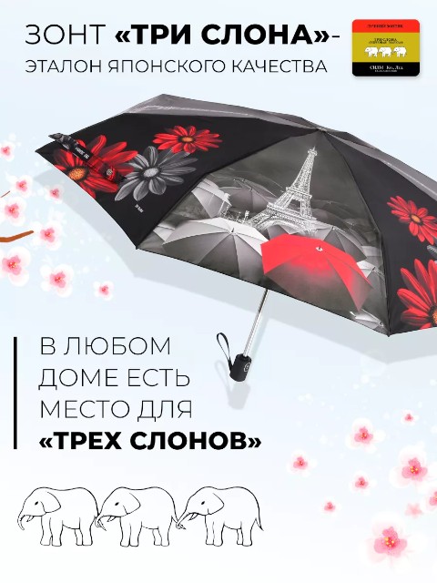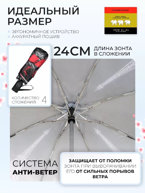 Женский компактный зонт «Три слона» — удобная складная модель для города, работы и поездок. Он занимает минимум места и легко помещается в сумку или рюкзак, поэтому подходит для ежедневного ношения. Купол оформлен рисунком красно‑серых цветов и пейзажа Парижа с темными акцентами — дизайн выглядит современно и сдержанно, хорошо сочетается как с повседневной, так и с более строгой одеждой.