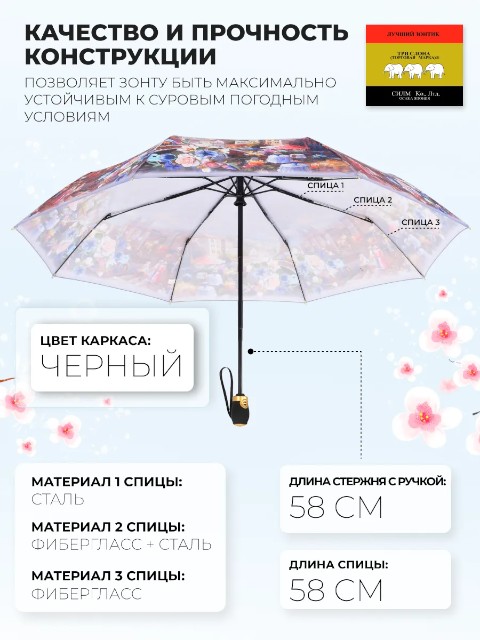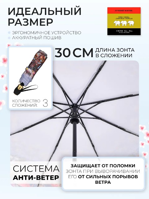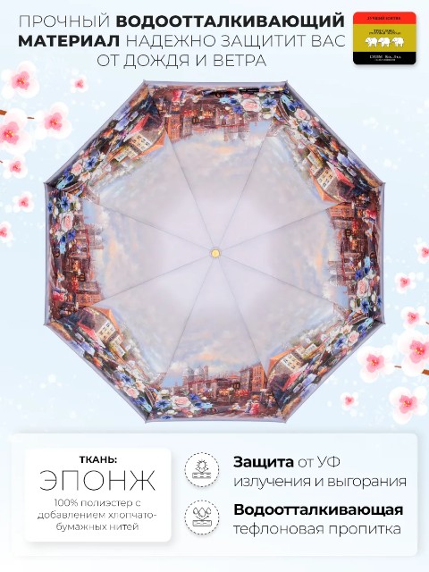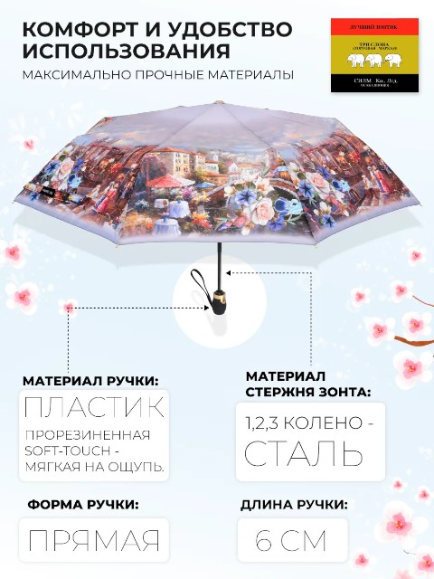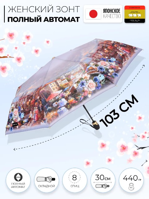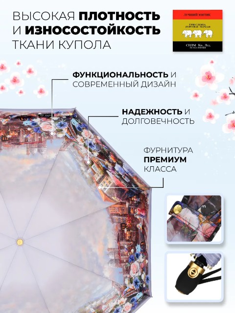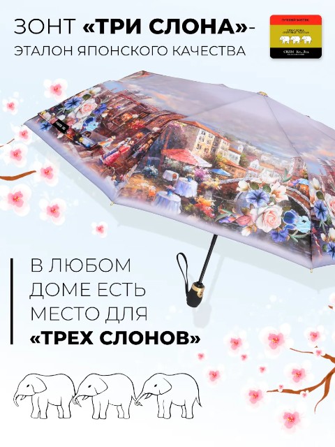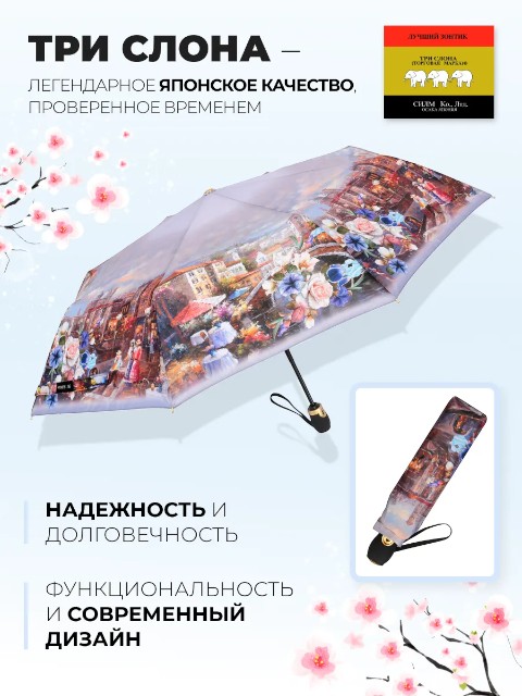 Изящный яркий женский зонт Три слона L3801 от дождя для женщин представляет известный японский производитель. Женский зонтик с ярким и романтичным видом прекрасного города. Будет приятно достать такой красочный зонт в пасмурную погоду. Зонт откроется и закроется мгновенно, нужно лишь нажать кнопку. Это полностью автоматическая система.