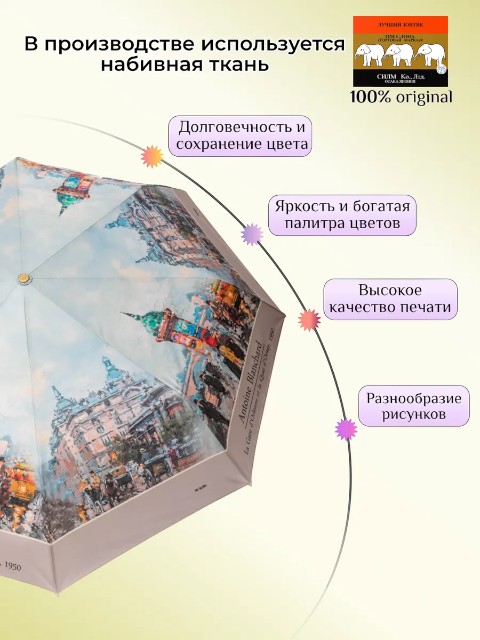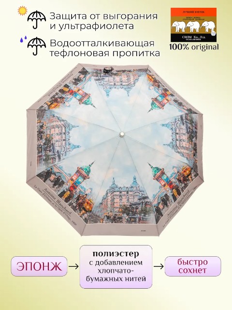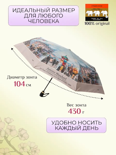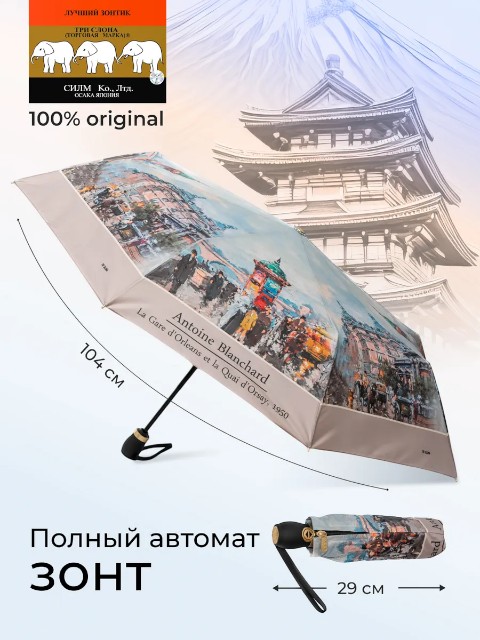 Женский зонт «Три слона» — удобный складной зонт для города, который сочетает надежность, практичность и выразительный дизайн. Модель выполнена в эффектной палитре красный/голубой/серый и относится к серии с репродукциями мировых художественных произведений. На куполе размещено изображение картины «Quai d'Orsay» Антуана Бланшара — современного французского художника, передавшего атмосферу Парижа XIX века. Такой рисунок делает зонт не только полезной вещью на дождливый день, но и стильным акцентом образа.
