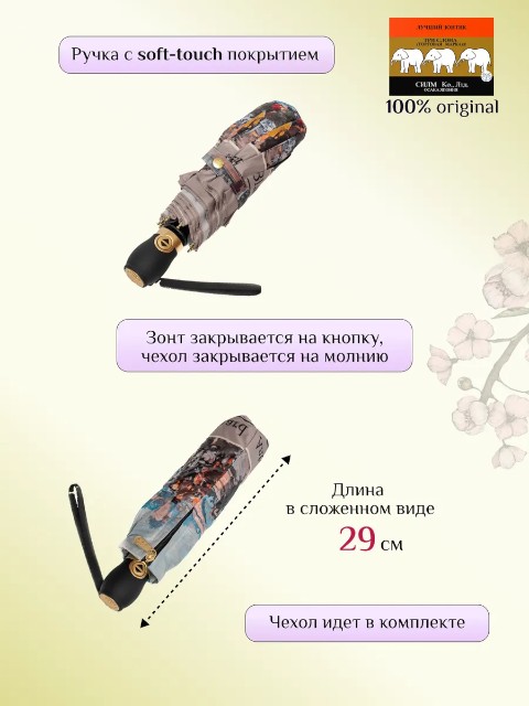 Ручка из пластика с покрытием soft touch приятна на ощупь и не скользит в ладони. В комплект входят аксессуары для хранения и подарка: чехол, чехол на молнии и подарочный пакет. На изделие предоставляется гарантия 12 месяцев. Бренд «Три слона» ценят за качество исполнения и внимание к деталям — то, что часто называют японским качеством. Модель относится к категории новинка 2026 и подойдет тем, кто хочет действительно «супер крутой» зонт: надежный, удобный и с художественным дизайном.