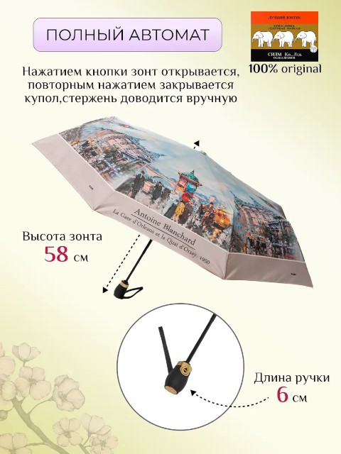 Зонт оснащен механизмом автомат: открыть купол можно нажатием кнопки, что особенно удобно в транспорте, у входа в здание или при выходе из автомобиля. Складная конструкция позволяет легко носить зонт с собой: длина в сложенном виде 29 см, поэтому он комфортно помещается в сумку или рюкзак. При этом купол диаметром 104 см обеспечивает хорошую площадь защиты от дождя.
