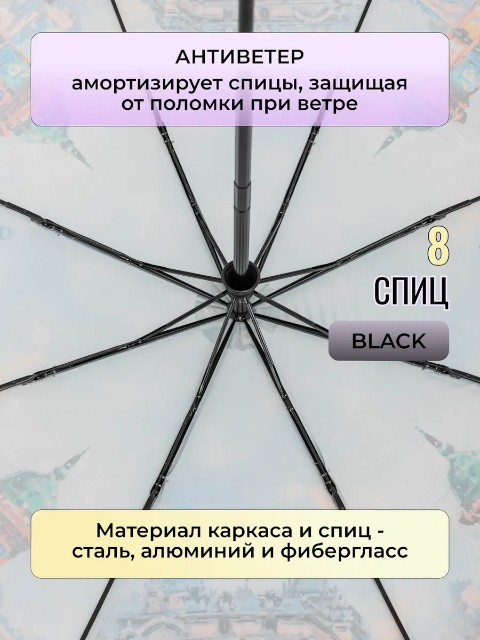 Конструкция разработана для частого использования. Усиленный стальной каркас отвечает за прочность и стабильную работу механизма. Купол держится на 8 спицах, а окончания спиц из фибергласа добавляют гибкости и повышают устойчивость к деформациям. Встроенная система «антиветер» помогает снизить нагрузку на каркас при порывистом ветре и уменьшает риск выворачивания зонта.