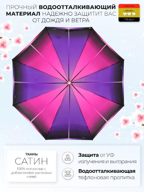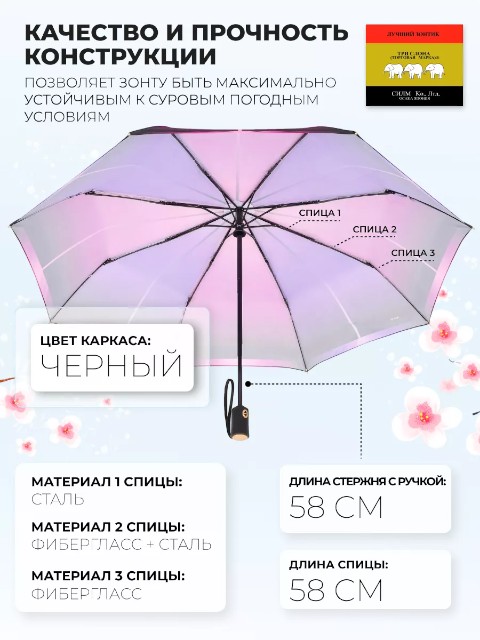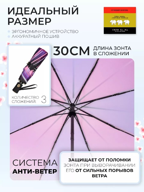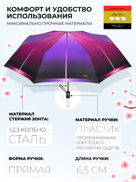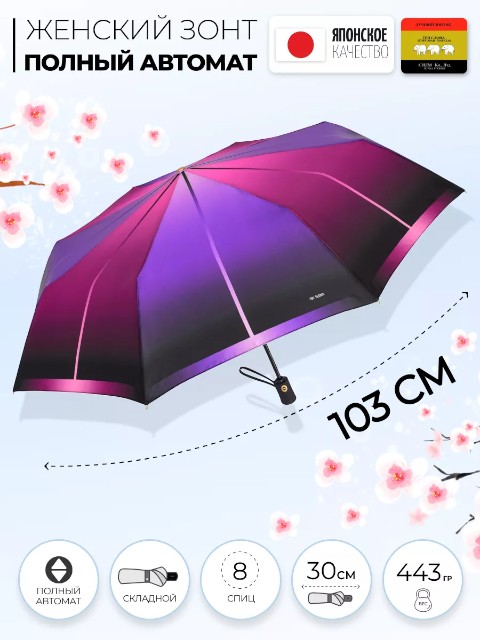 Модель оснащена автоматическим механизмом: зонт быстро открывается нажатием кнопки. Конструкция компактная — в сложенном виде длина составляет 30 см, поэтому зонт удобно носить в сумке или держать в машине. Диаметр купола — 101 см (измерение по низу от спицы до спицы), этого достаточно для комфортной защиты от осадков.