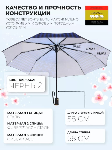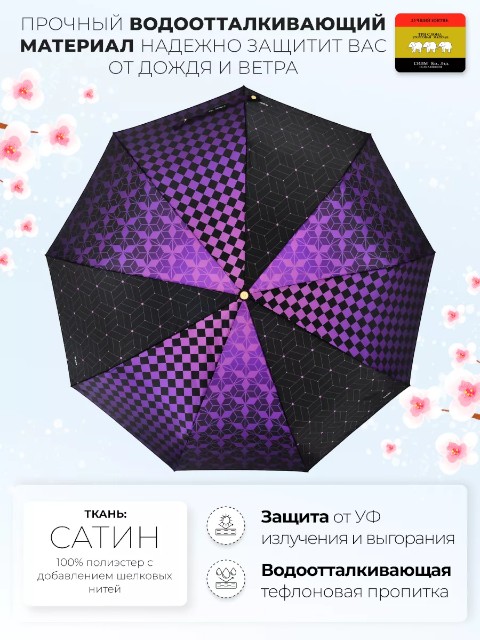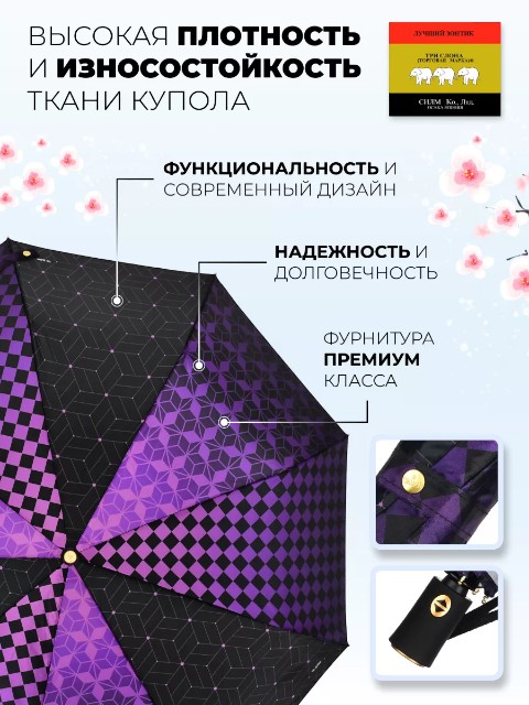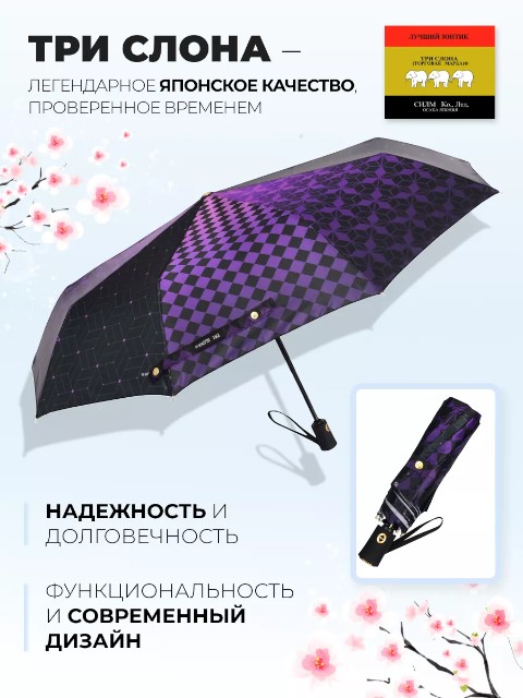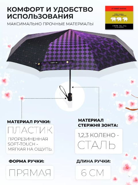 Женский зонт «Три слона» создан для ежедневного использования в городской погоде — когда дождь и ветер могут застать внезапно. Механизм полный автомат позволяет быстро открыть и закрыть зонт одной кнопкой, поэтому им удобно пользоваться в транспорте, у подъезда или при выходе из автомобиля.