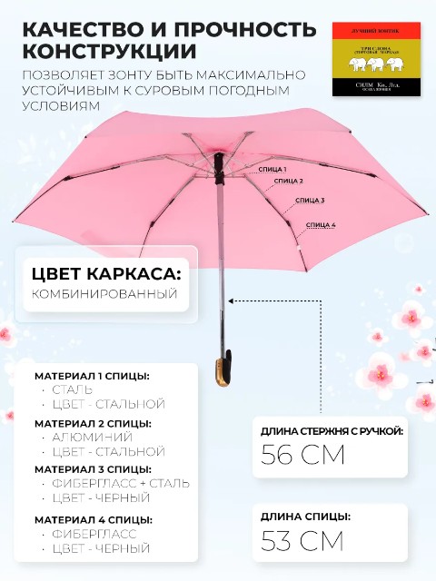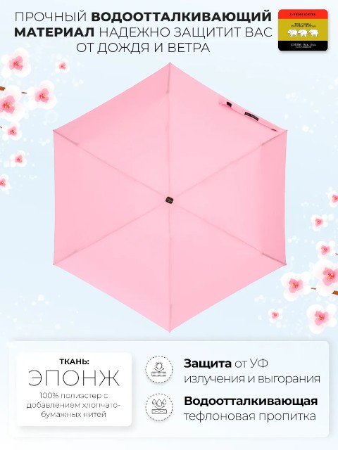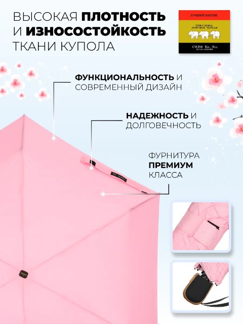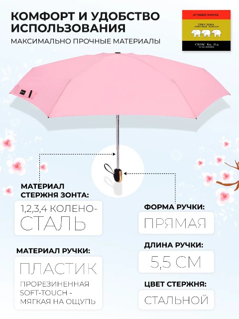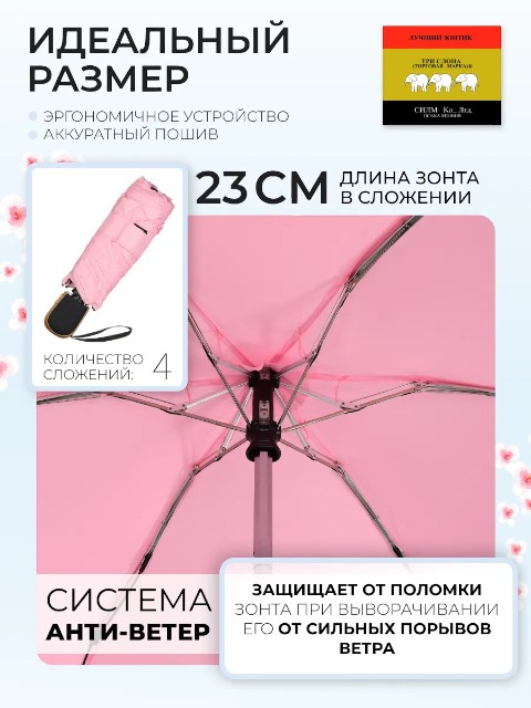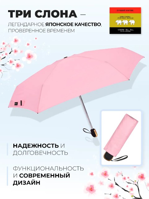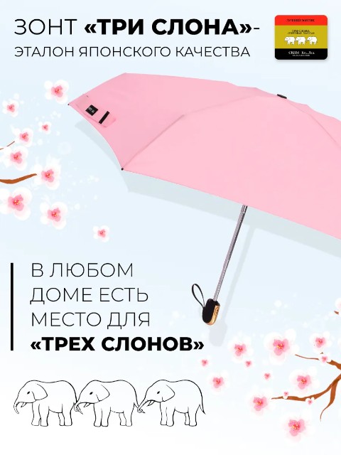 Женский зонт «Три слона» — удобный мини-зонт для города, который легко носить с собой каждый день. Благодаря конструкции 4 сложения он занимает минимум места: длина в сложенном виде составляет 23 см, поэтому зонт без труда помещается в сумку или рюкзак. При этом купол 98 см обеспечивает уверенную защиту от дождя.