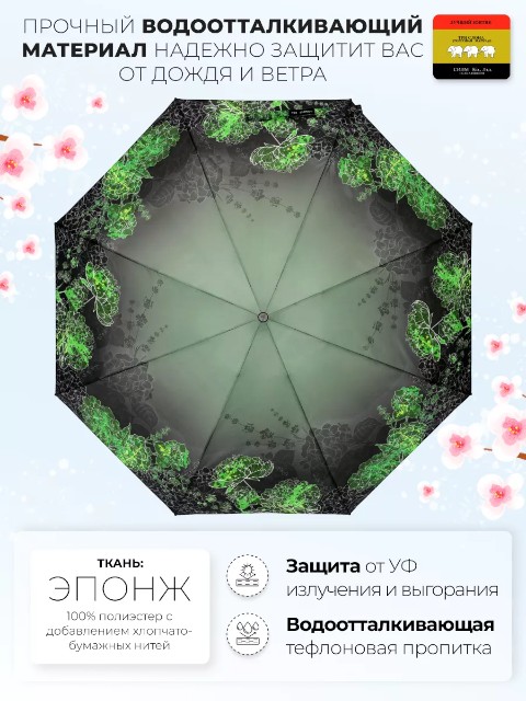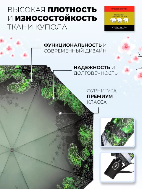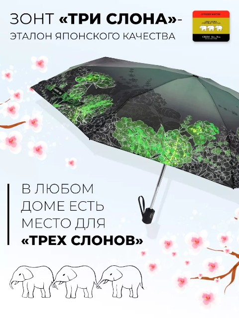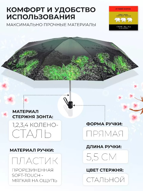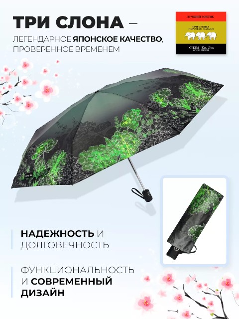 Женский складной зонт «Три слона» — удобный аксессуар для переменчивой погоды. Купол украшен цветочным рисунком, а сочетание березово‑зеленого и желтовато‑зеленого оттенков выглядит мягко и гармонично, подходит для повседневных образов.