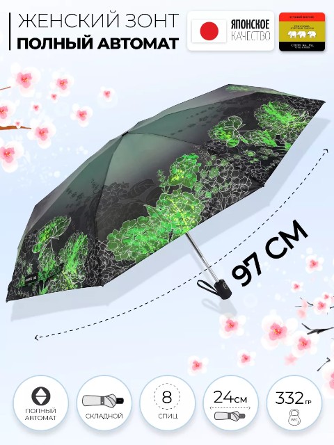 Модель оснащена механизмом полный автомат: зонт легко открывается и закрывается нажатием кнопки. В сложенном виде он занимает минимум места — 24 см, весит 332 г, поэтому его удобно носить с собой каждый день.