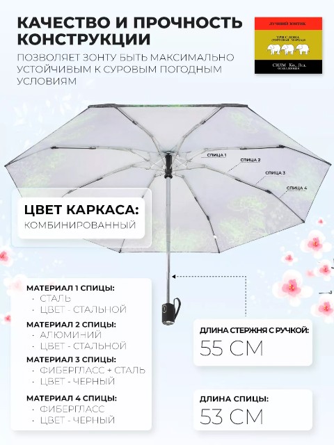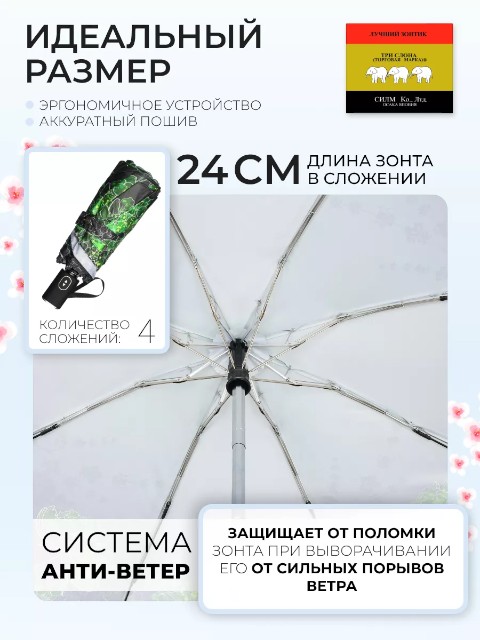 В комплект входят зонт, чехол и фирменный пакет «Три слона» — модель удобно хранить и можно выбрать в качестве подарка женщине на 8 марта, день рождения или Новый год.