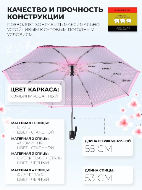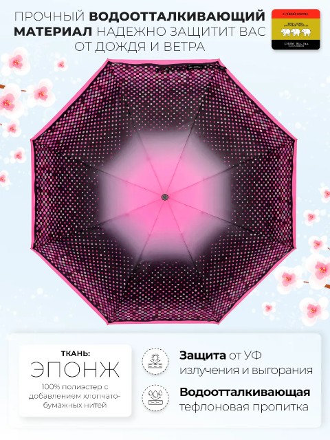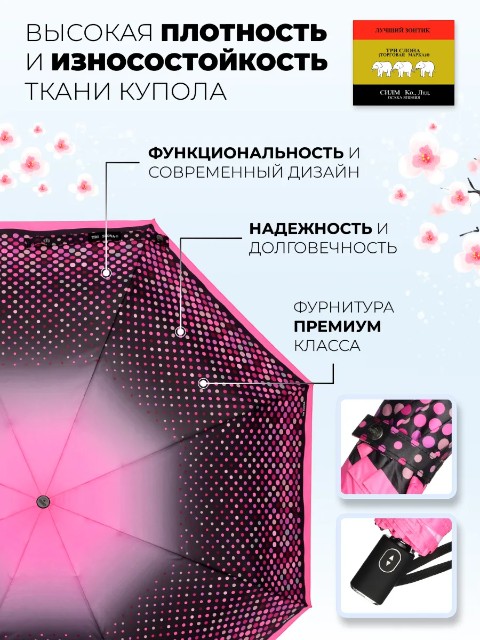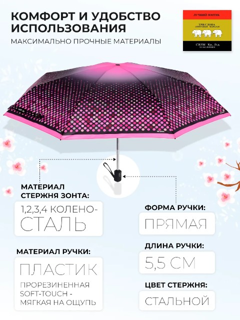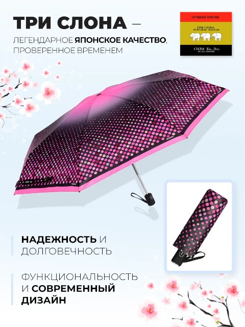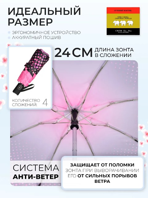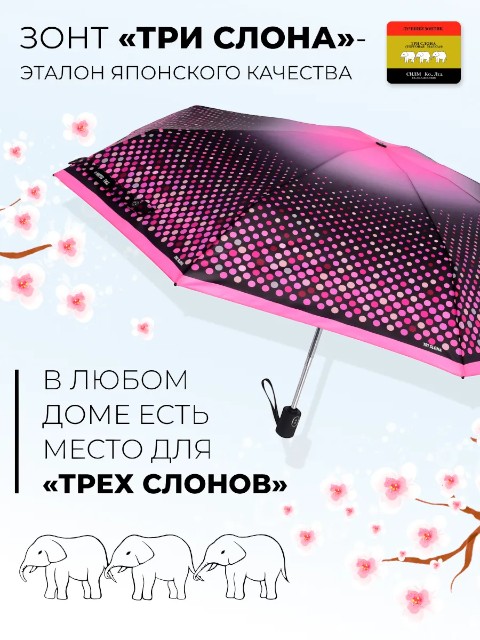 Компактный женский зонт «Три слона» в 4 сложения — удобный вариант для города и поездок, когда важно, чтобы зонт занимал минимум места и при этом надежно защищал от дождя.