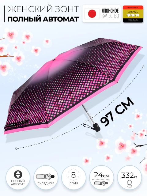 Модель оснащена механизмом полный автомат: зонт открывается и закрывается нажатием кнопки. В сложенном виде длина всего 24 см, поэтому он легко помещается в сумку. В раскрытом состоянии купол диаметром 97 см обеспечивает комфортное укрытие, длина стержня — 56 см.