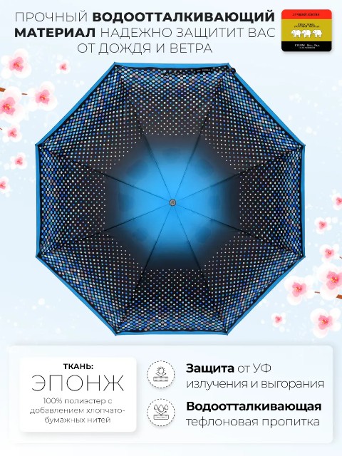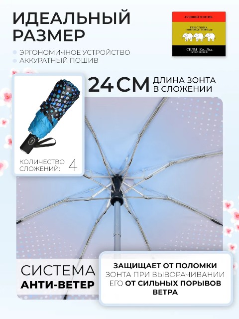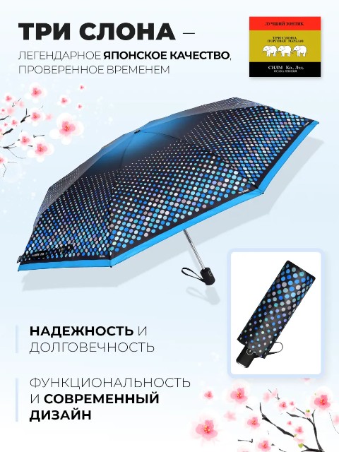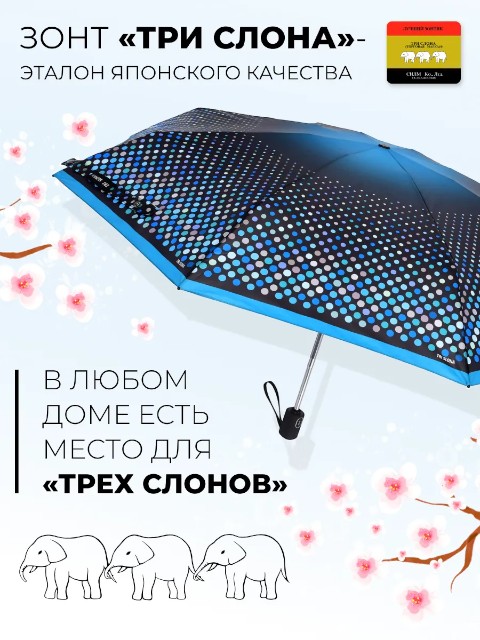 Женский складной зонт «Три слона» — компактная модель в 4 сложения для города, поездок и ежедневного ношения. Зонт выполнен в сочетании темно-синего/голубого/черного оттенков, купол украшен аккуратным принтом «горох».
