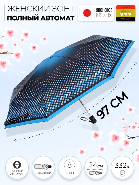 Механизм полный автомат позволяет быстро открыть и закрыть зонт нажатием кнопки. В сложенном виде длина всего 24 см, поэтому он легко помещается в сумку или рюкзак. Купол диаметром 97 см обеспечивает надежную защиту от дождя, а 8 спиц и облегченный каркас дают баланс прочности и удобного веса (332 г). На хлястике предусмотрена кнопка-фиксатор для аккуратного хранения.