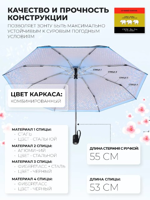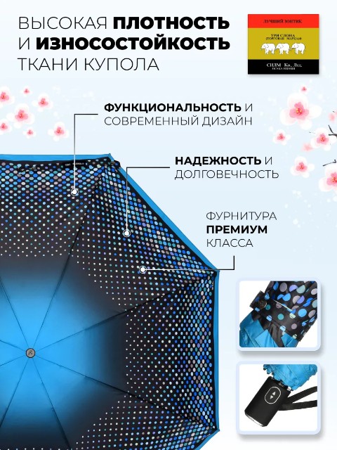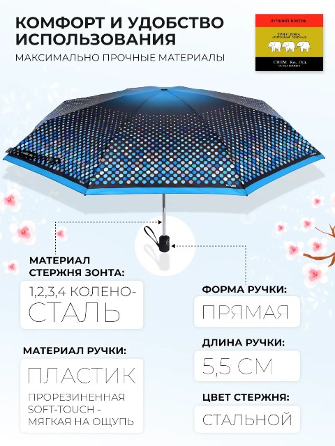 В комплект входят зонт, чехол и фирменный пакет «Три слона» — удобно для хранения и в качестве подарка.