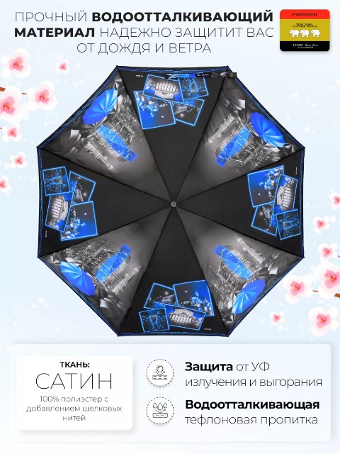 Механизм автомат позволяет быстро открыть и закрыть зонт нажатием кнопки. Купол выполнен из ткани сатин с тефлоновым водоотталкивающим покрытием: капли быстрее скатываются, материал меньше намокает и быстрее сохнет.