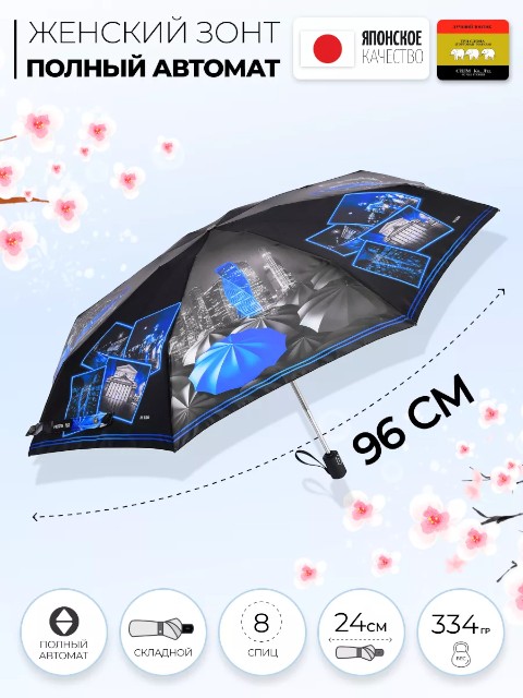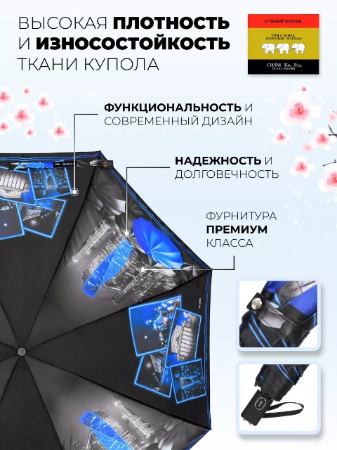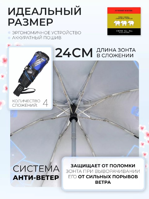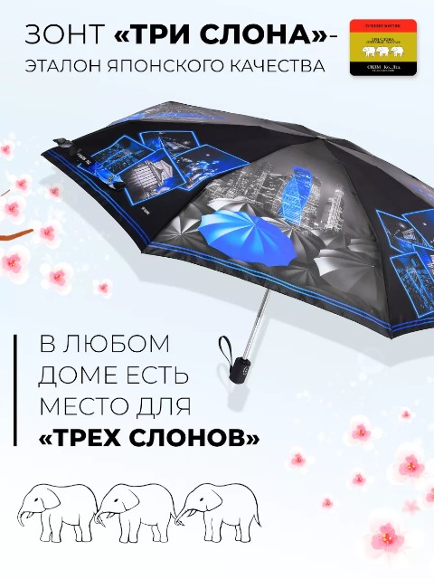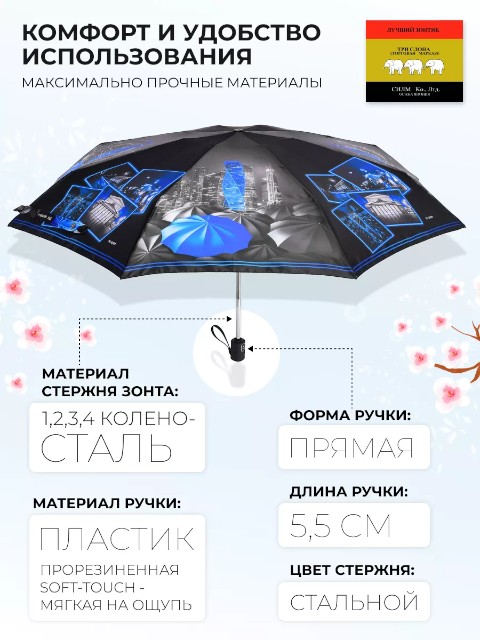 Женский компактный зонт «Три слона» — складная модель для города и поездок, которая удобно помещается в сумку и подходит для ежедневного использования. Купол оформлен черно‑серым пейзажем Лондона с голубыми акцентами, благодаря чему зонт выглядит современно и легко сочетается с разной одеждой.