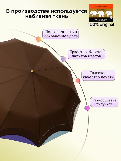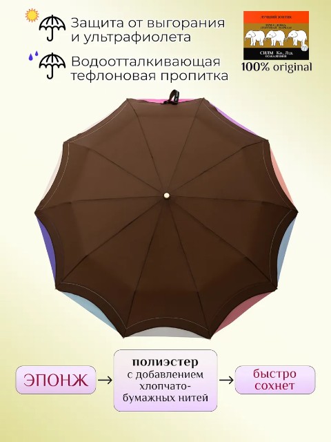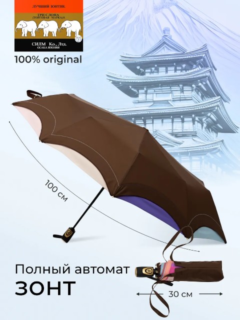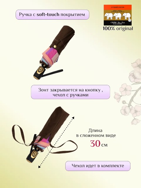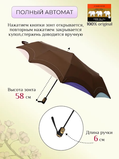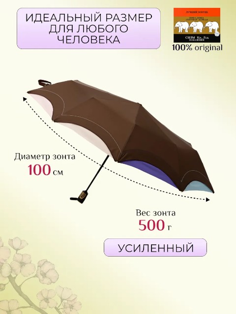Женский складной зонт «Три слона» — надежный аксессуар для города и поездок, рассчитанный на дождливую погоду и порывистый ветер. Модель выполнена в универсальном коричневом цвете, который легко сочетается с повседневной и деловой одеждой. Это удобный вариант «на каждый день», когда важно, чтобы зонт был прочным, быстро раскрывался и не занимал много места в сумке.