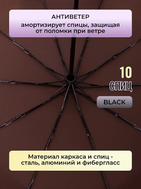 Ключевое преимущество модели — усиленная конструкция. Стальной каркас отвечает за жесткость и стабильность, а 10 спиц равномерно распределяют нагрузку и помогают куполу лучше держать форму. Окончания спиц из фибергласа добавляют гибкости и уменьшают риск деформации при резких порывах. Встроенная система «антиветер» снижает нагрузку на каркас в ветреную погоду и повышает устойчивость зонта в сложных условиях.