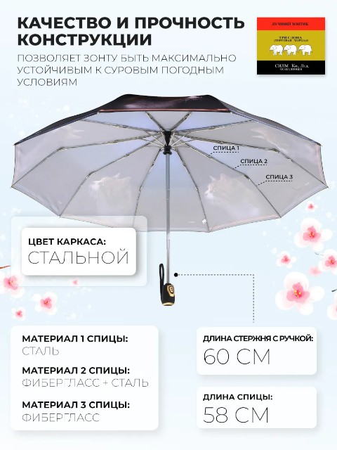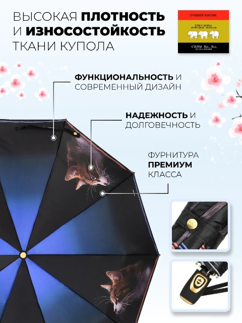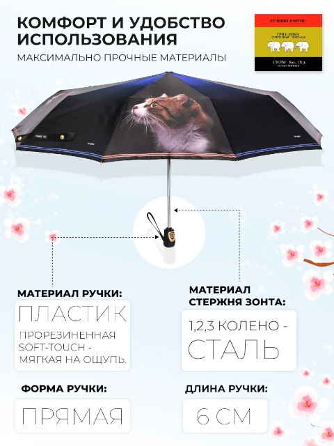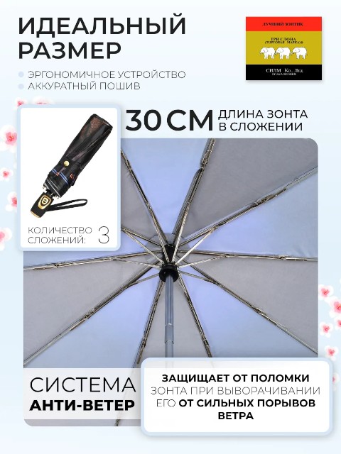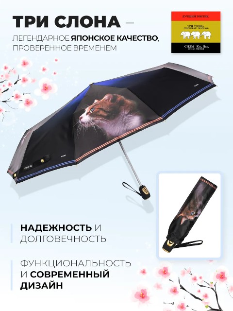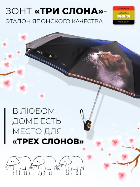 Женский зонт «Три слона» рассчитан на ежедневное использование в городе, когда погода меняется быстро и важно иметь надежную защиту от дождя и ветра. Модель оснащена механизмом полный автомат: зонт открывается и закрывается одной кнопкой, что удобно в транспорте, у входа в здание или при выходе из автомобиля.