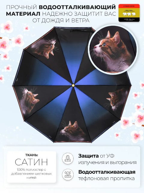 Купол изготовлен из сатина с тефлоновой пропиткой. Сатиновая ткань имеет гладкую, презентабельную поверхность, а тефлоновое покрытие улучшает водоотталкивание: капли быстрее скатываются, материал меньше намокает, легче очищается и быстрее сохнет. Дизайн купола с изображением котов делает модель ярким аксессуаром и добавляет настроения даже в пасмурный день.