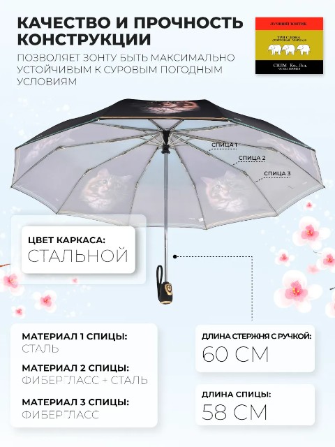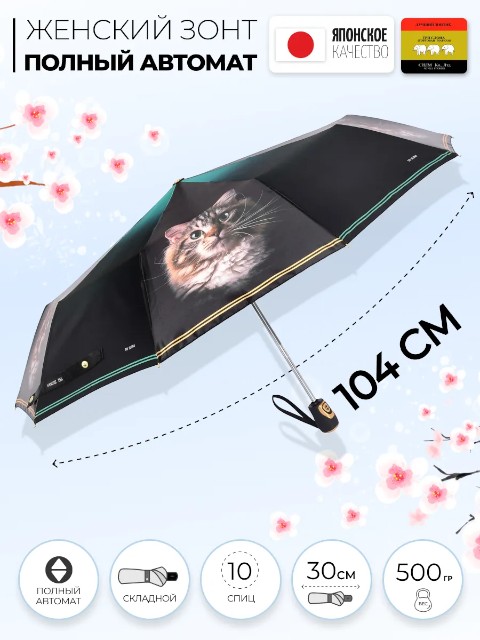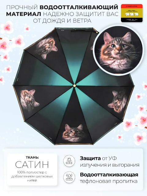 Купол изготовлен из сатина с тефлоновой пропиткой. Сатин имеет гладкую, более нарядную фактуру, а тефлоновое покрытие усиливает водоотталкивающий эффект: капли быстрее скатываются, ткань меньше намокает, легче очищается и быстрее сохнет. Дизайн с изображением котов делает зонт заметным аксессуаром и хорошо подходит для тех, кто любит оригинальные принты.