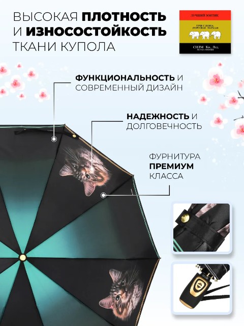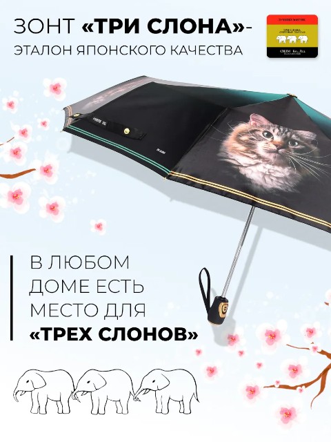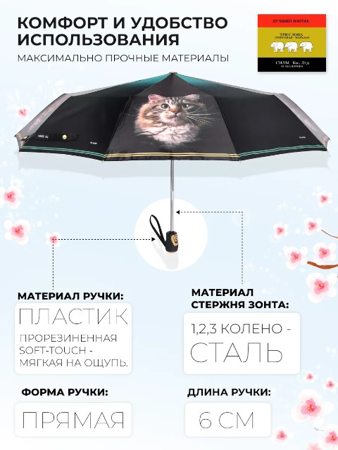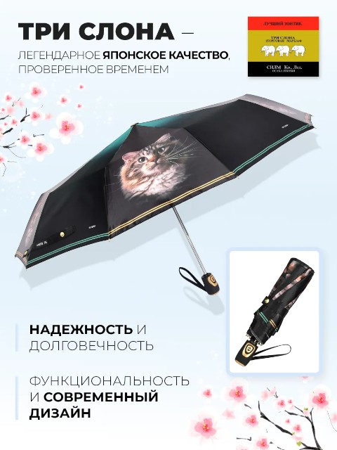 Женский зонт «Три слона» подходит для повседневного использования в городе, когда важно быстро защититься от дождя и ветра. Модель оснащена механизмом полный автомат: зонт открывается и закрывается нажатием одной кнопки — удобно в транспорте, у входа в помещение и при выходе из автомобиля.
