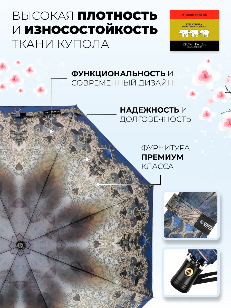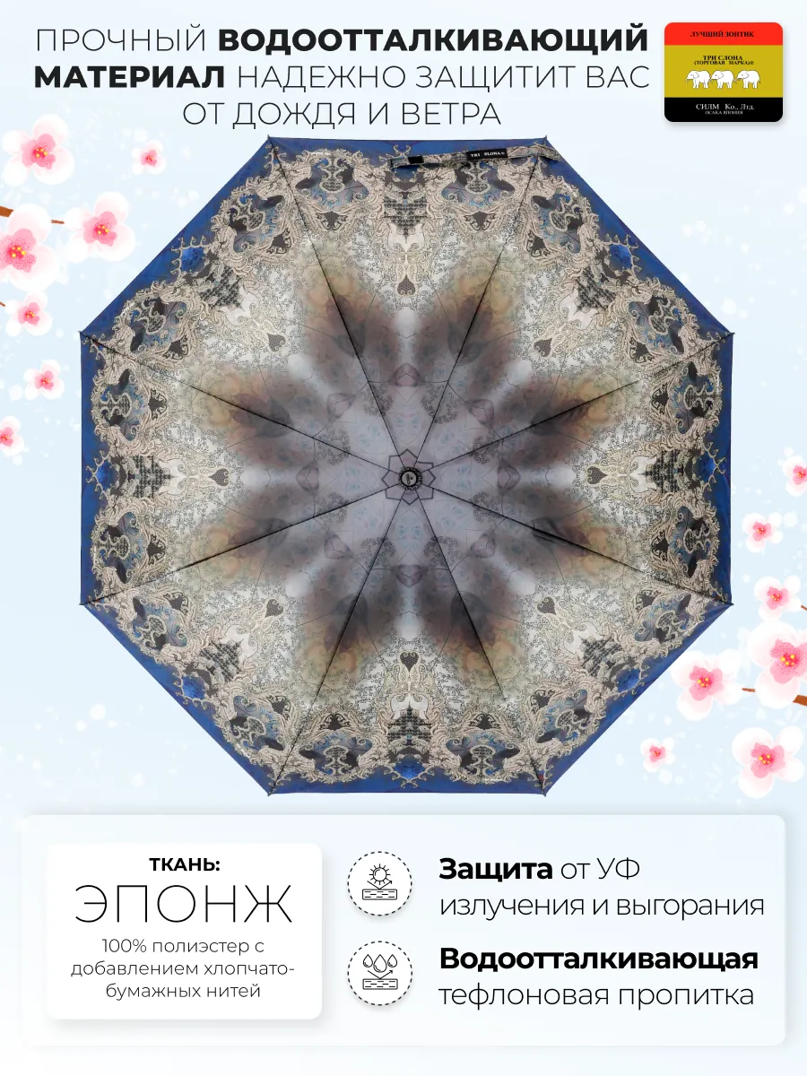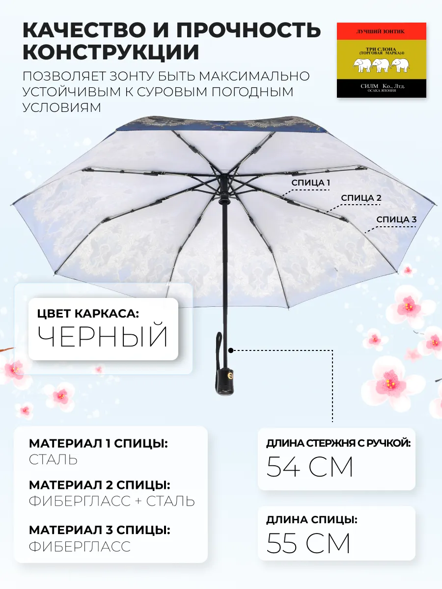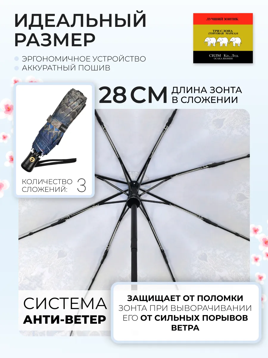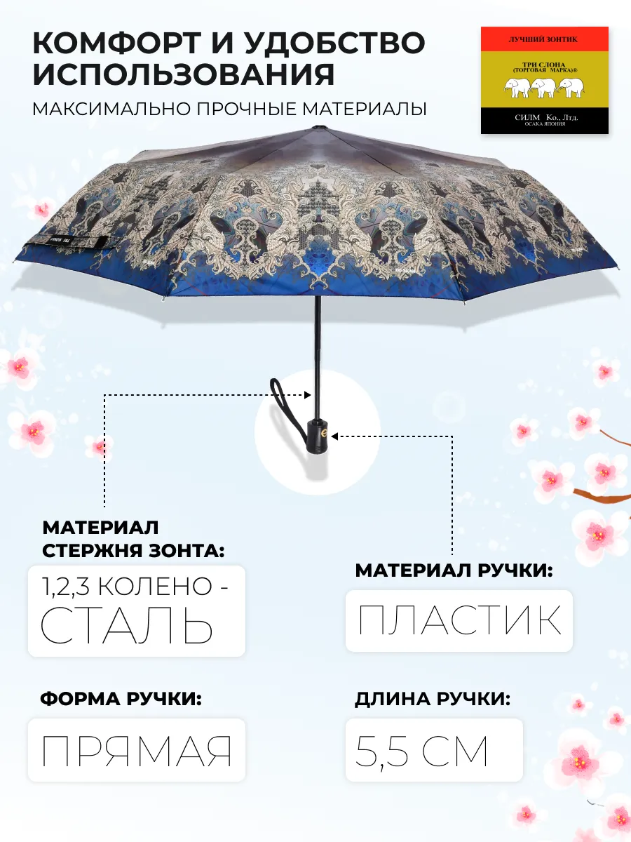Женский зонт «Три слона» — удобный и надежный аксессуар для города, который подходит для ежедневного использования в дождливую погоду и при порывистом ветре. Модель выполнена в конструкции 3 сложения: в сложенном виде зонт занимает минимум места в сумке, а в раскрытом обеспечивает комфортную защиту от осадков.